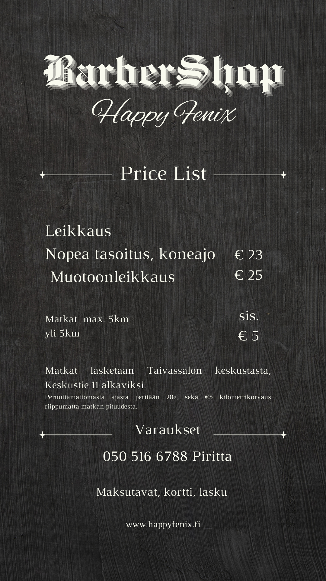 Happy Fenix tarjoaa parturi/ kampaamo palveluita Taivassalon seudulla, niin vakituisille-, kuin vapaa-ajan asukkaillekin.